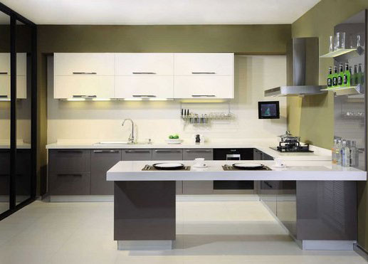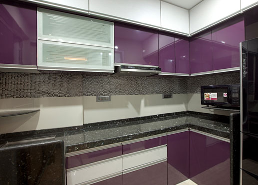Stylish straight-line kitchens that leaves impression on anyone. All its reflective & glassy surfaces make your kitchen big & bold. In this we use only color laminates & back painted glass with all aluminum profile handles & aluminum edge shutters.